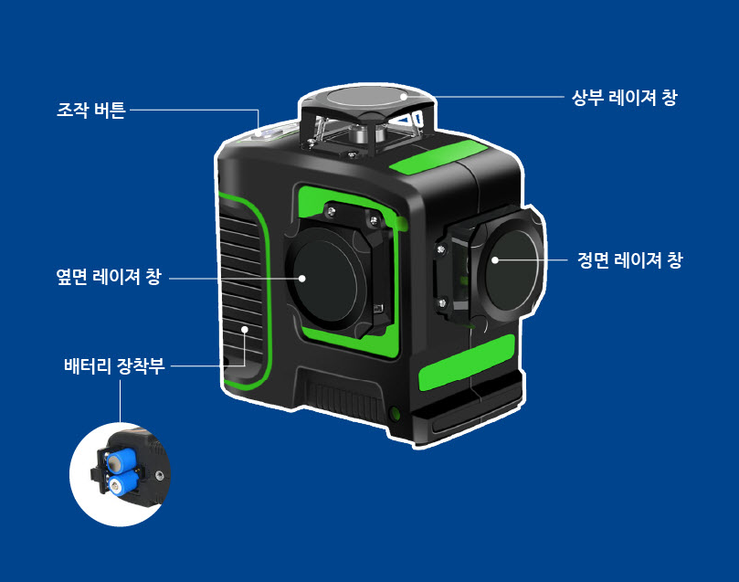 기타 특징 : 최소 7mm 거리 측정, 연속 10시간 사용, 경사측모드 사용가능, 자동보정범위 3도 벗어나면 경고음알림