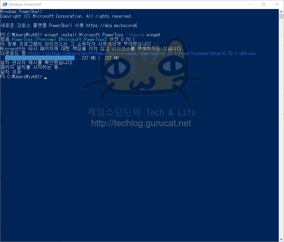 아래와 같이 윈도우 패키지 매니저가 PowerToys 를 다운로드 후 설치 한다.