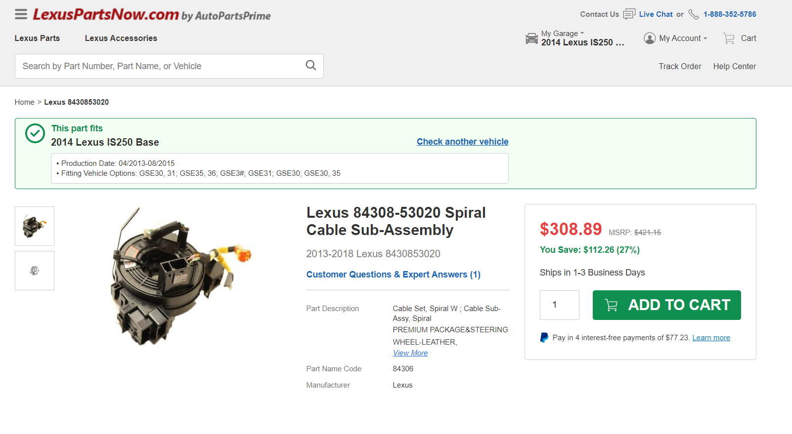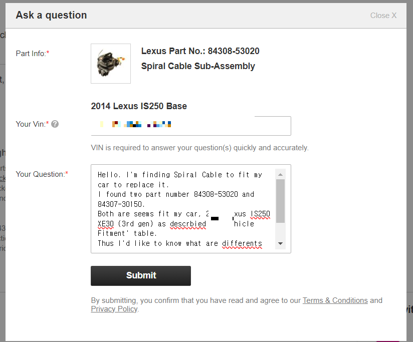 | Hello. I'm finding Spiral Cable to fit my car to replace it. I found two part number 84308-53020 and 84307-30150. Both are seems fit my car, 2014 Lexus IS250 XE30 (3rd gen) as descrbied at 'Vehicle Fitment' table. Thus I'd like to know what are differents between this(84308-53020) and 84307-30150. Could you tell me what is major differ? |