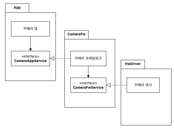 예를들어, 하위모듈인 '카메라센서' 모듈은 카메라센서 시작, 중지, 정지화면 촬영, 연속화면 촬영(동영상) 등의 기능을 제공할 수 있고 상위모듈인 '카메라 앱'은 이 제공되는 기능들을 사용하는 의존성 관계이다.