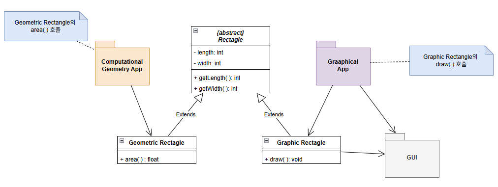 기존 Rectangle class는 Geometric Rectangle 이라는 class로 이름을 변경하고, 여전히 사각형의 길이와 너비를 갖고 area( )를 넓이를 계산하는 역할을 한다. 그리고, 사각형을 그리는 기능은 를 Graphic Rectangle 이라는 별도의 class로 분리했고, draw( ) 메소드는 Geometric Rectangle을 참조해서 가 GUI를 그릴 수 있다.