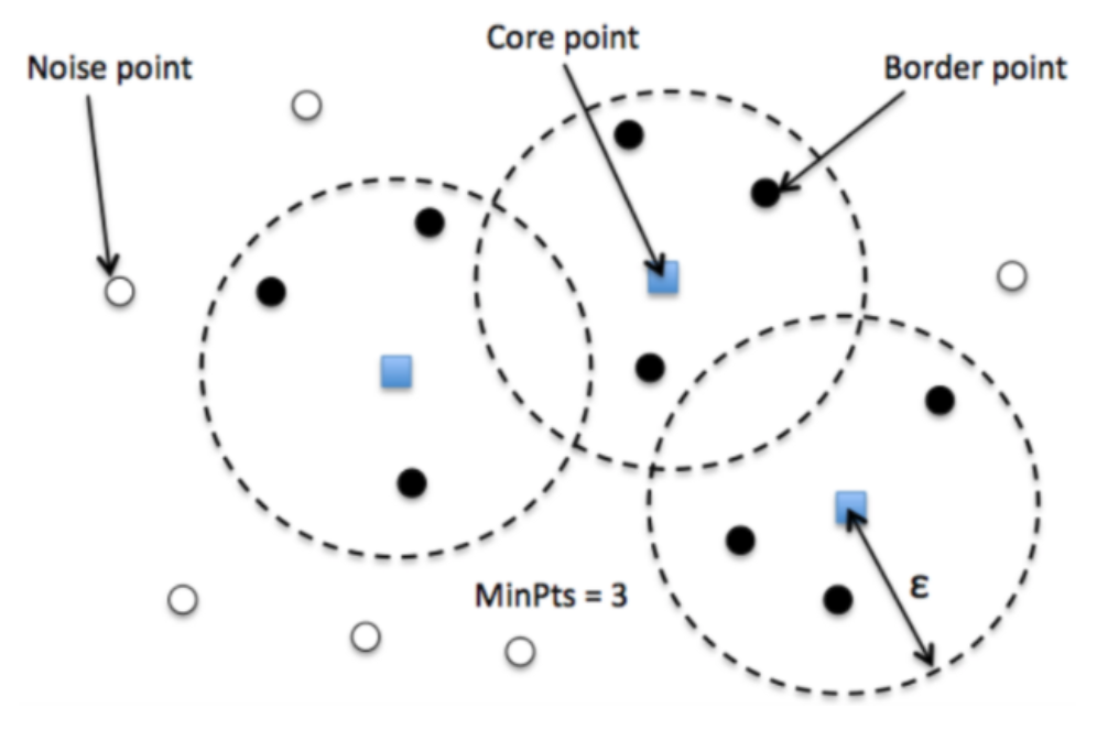 DBSCAN 클러스터링이 완료된 후에는 세 가지 유형의 지점이 있는데, 각각은 아래 그림에서 찾아볼 수 있습니다.