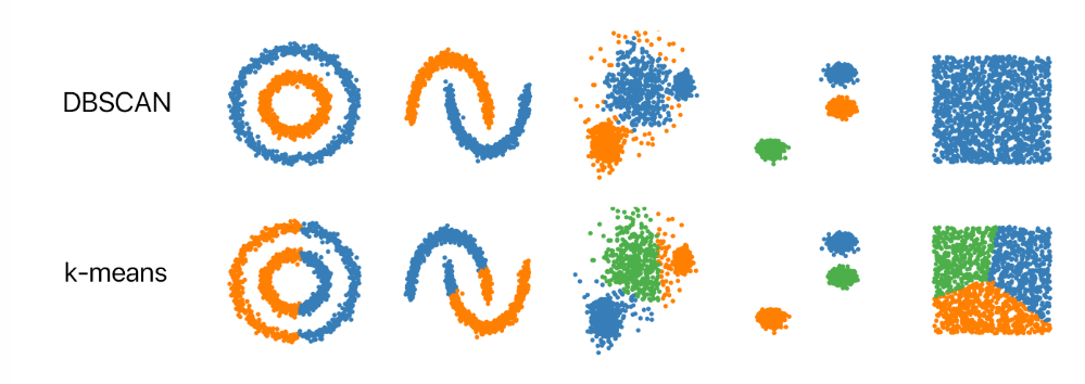 DBSCAN의 장점은 사용하기 위해 클러스터 수를 지정할 필요가 없다는 것입니다. 필요한 것은 값 사이의 거리를 계산하는 함수와 "가까운" 거리로 간주되는 정도에 대한 지침뿐입니다. DBSCAN은 다양한 분포에서 k-평균보다 더 합리적인 결과를 생성합니다. 아래 그림은 그 사실을 보여줍니다.