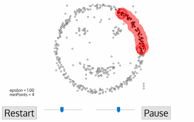 - 알고리즘은 데이터 집합에서 임의로 한 점을 선택하여 (모든 점을 방문할 때까지) 진행합니다.